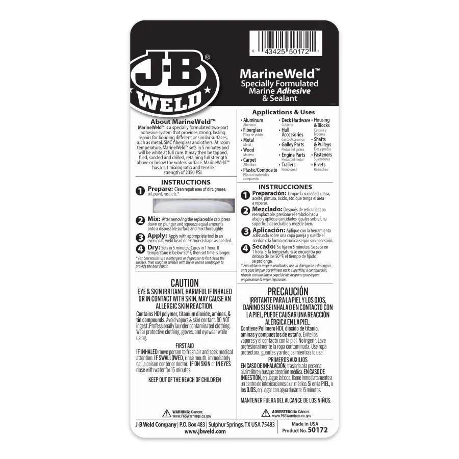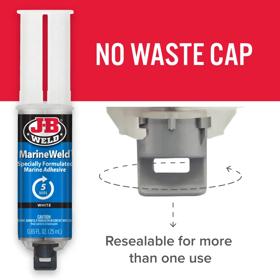 J-B Weld MarineWeld Syringe is a specially formulated two-part adhesive system that provides strong, lasting repairs for bonding different or similar surfaces, such as metal, SMC fiberglass and others. MarineWeld has a 1:1 mixing ratio and tensile strength of 2350 PSI.