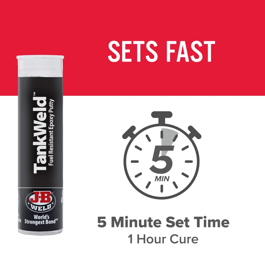 TankWeld™ is a hand-mixable, steel-reinforced, non-rusting epoxy putty that quickly repairs or rebuilds anything made of metal. After mixing, it forms an industrial-strength polymer compound that can be molded into shapes or used to build up, patch and repair steel components. TankWeld™ sets in 5 minutes and after 60 minutes, can be drilled, tapped, machined, ground, filed and painted. TankWeld™ cures to a dark grey color, is rated at a tensile strength of 4000 PSI and will withstand temperatures up to 300ºF.